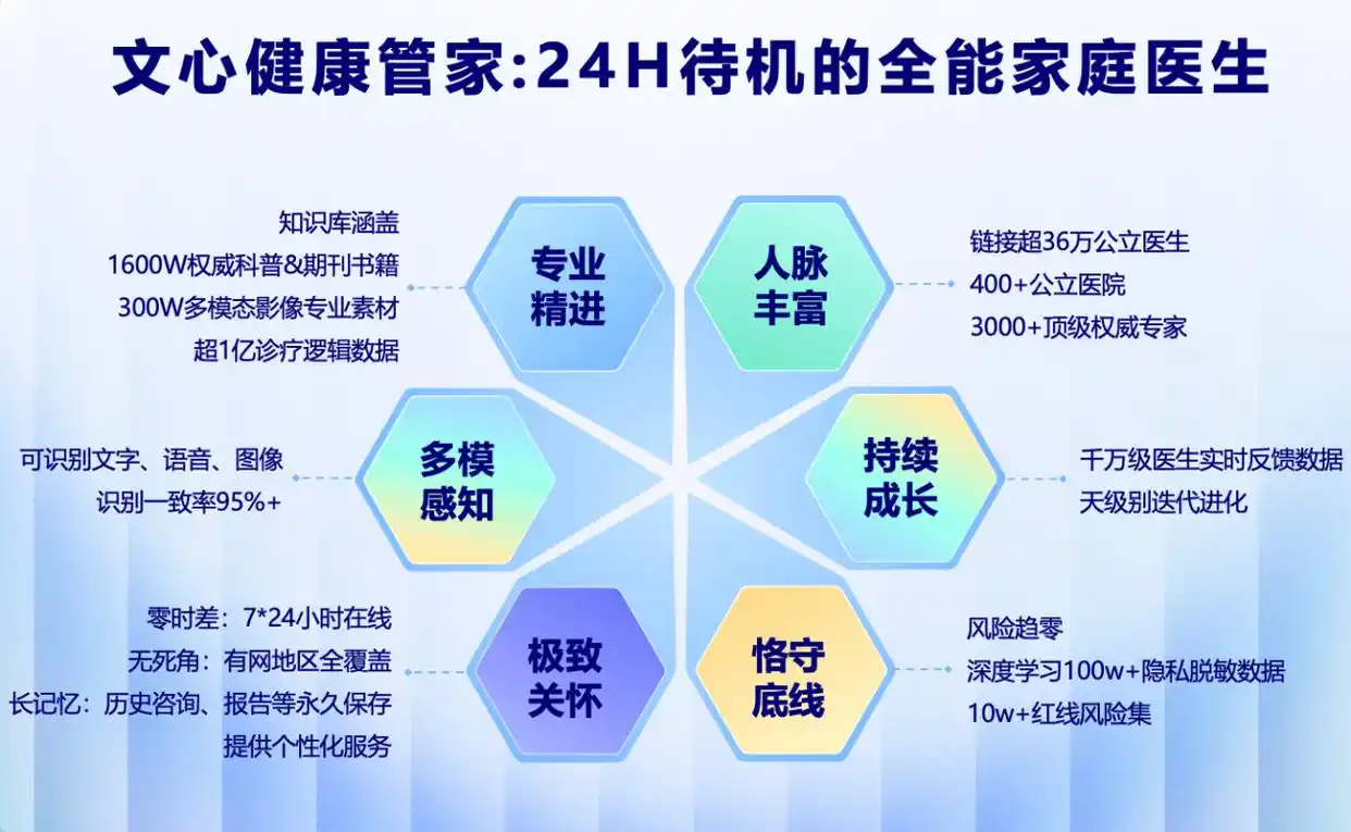 据介绍,文心健康管家具备专业精进、人脉丰富、多模感知、持续成长、极致关怀、恪守底线六大优势。