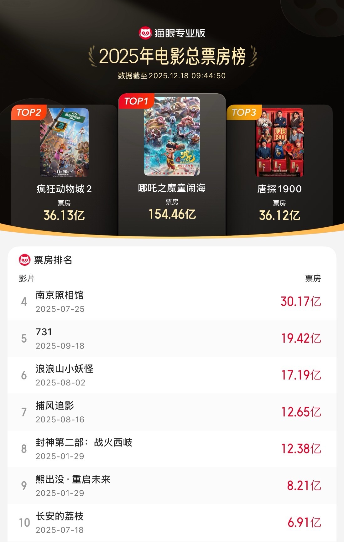 12 月 18 日消息,据猫眼专业版数据,电影《疯狂动物城 2》累计票房(含预售)突破 36.13 亿,进入 2025 年度票房榜前二。总榜前十如下: