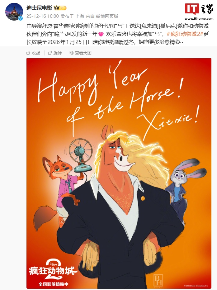 据IT之家此前报道,迪士尼电影官方在 12 月 16 日宣布,《疯狂动物城 2》宣布延长放映至 2026 年 1 月 25 日。官方还分享了由导演拜恩・霍华德特别绘制的新年贺图。