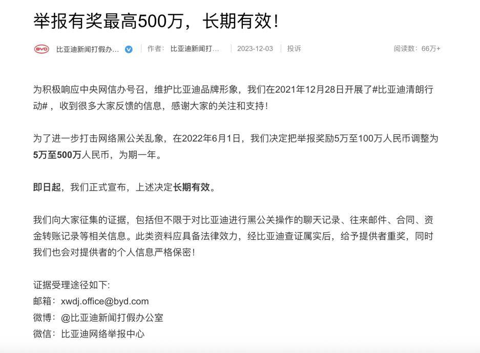 当前,网络上针对车企的恶意诋毁、虚假造谣行为频发,包括比亚迪在内的众多车企均在积极采取行动捍卫自身品牌权益。2021年,比亚迪率先宣布悬赏5万至100万元打击恶意黑公关,后续又将举报奖励提升至5万至500万元且长期有效。近年来,比亚迪已针对多个持续发布恶意言论、编造虚假信息的“黑号”发起诉讼并胜诉,不仅为自身挽回了声誉损失,更形成了对网络侵权行为的有效震慑。
