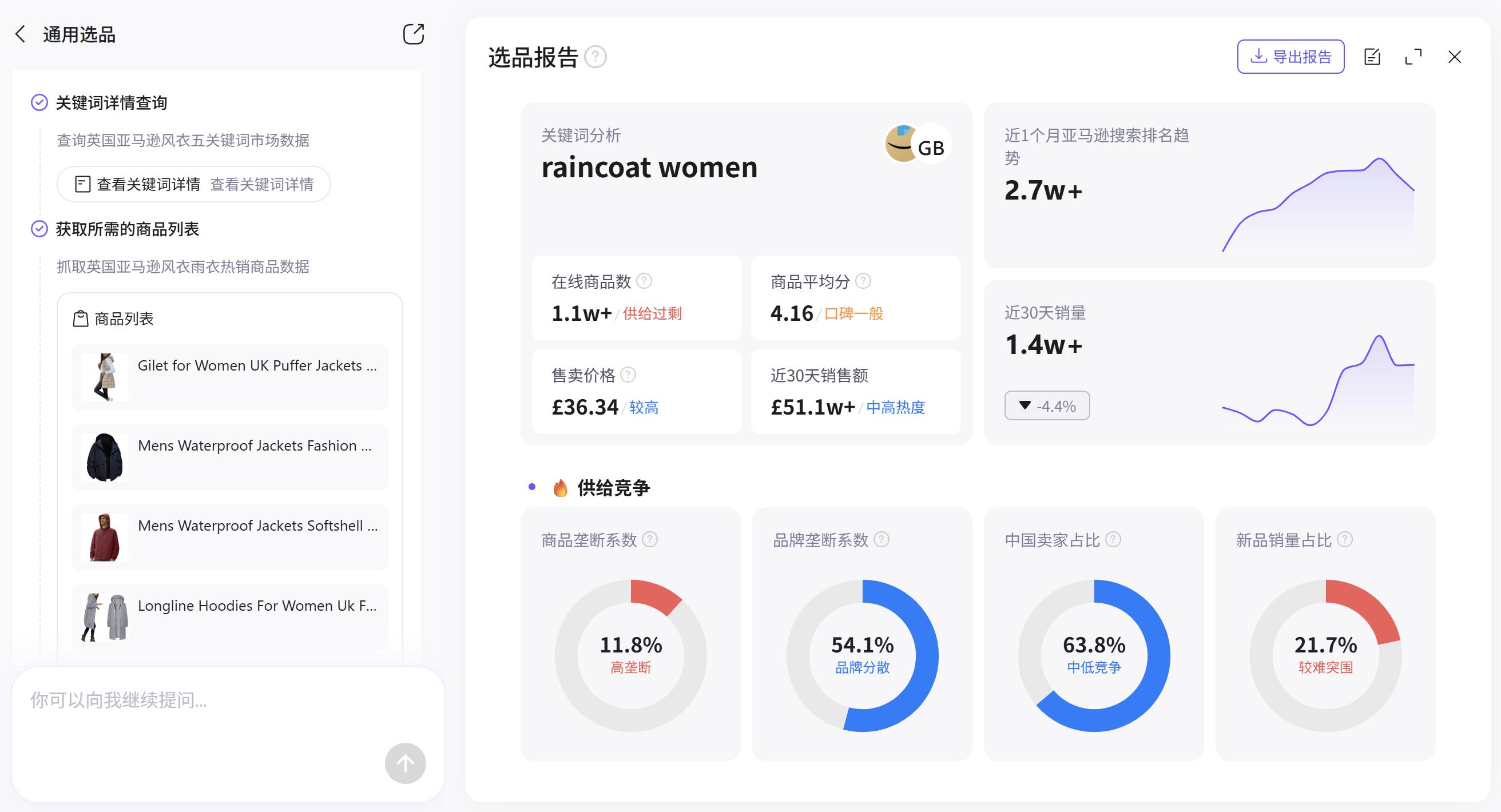 无论是判断“美国市场的瑜伽裤有哪些蓝海细分品类”,还是分析“英国什么款式的风衣好卖”,AI都能在几分钟内生成专业报告,而一个成熟的传统买手完成同样的工作需要的时间要长得多。