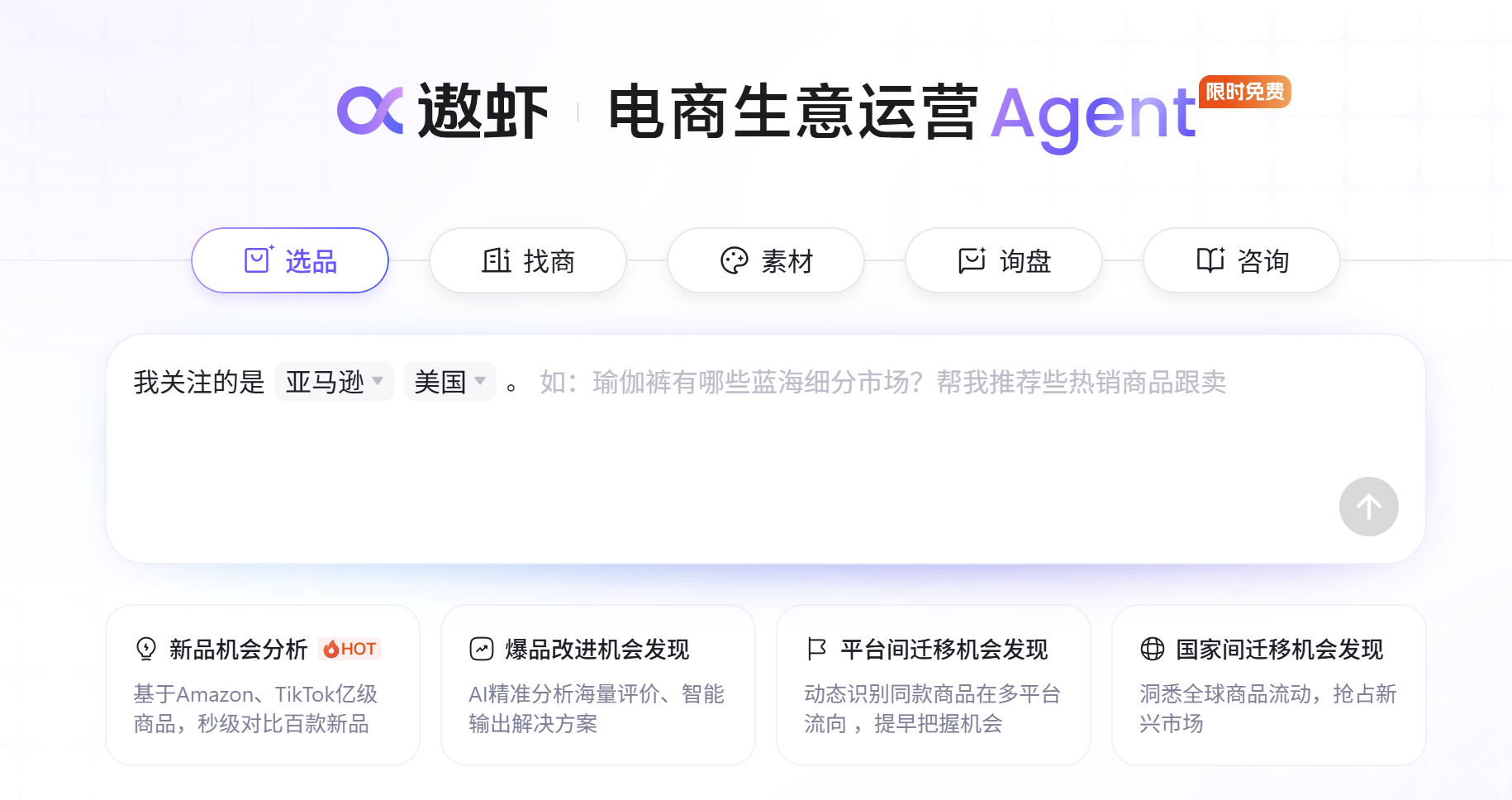 不久前,1688推出跨境AI智能体“遨虾”(海外品牌名AlphaShop),聚焦跨境电商全流程,整合了选品决策、工厂寻源、素材生成、智能询价、问题咨询五大核心能力。