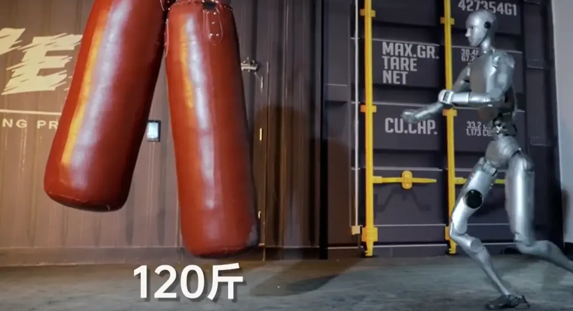 随后,机器人在空中展示了回旋踢,轻松将吊起来的西瓜踢得粉碎。不仅如此,还一脚将两个60公斤沙包踹开,并且稳稳站住。对此网友表示:“好好好,离终结者又进一步”。
