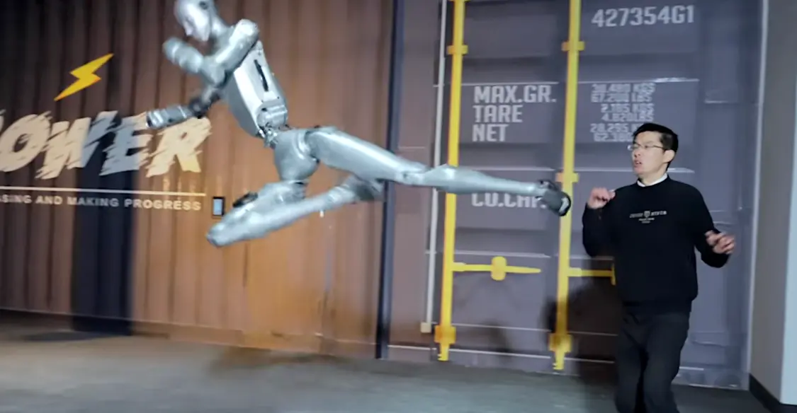 视频中,机器人先是表演了“箭步杀”,宇树科技CEO王兴兴连连后退,闪躲过飞踢。