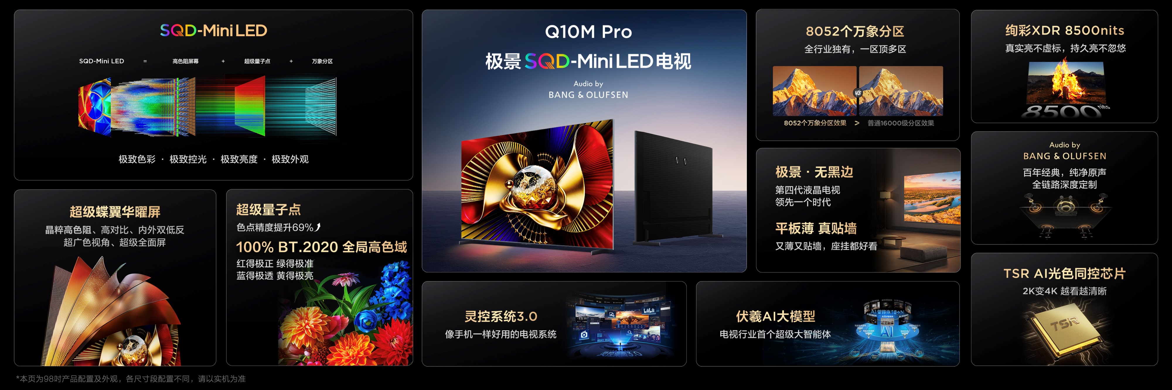 作为技术集大成者,Q10M Pro完整继承了与X11L同源的SQD-Mini LED全套解决方案,将“画质铁三角”拉满。其中,98吋版本拥有高达8052个万象分区,绚彩XDR峰值亮度达到8500nits,配合100% BT.2020全局高色域,无论是观看HDR大片、玩3A游戏,还是欣赏4K纪录片,都能带来沉浸式的视觉体验。设计上,Q10M Pro采用好评如潮的“极景·无黑边”外观,以近乎100%的屏占比和超薄机身,成为家居环境中的美学标杆。体验层面,其搭载与Bang & Olufsen深度定制的专业音响系统、灵控系统3.0以及融合多家主流AI能力的伏羲大模型,同时配备满血HDMI 2.1接口,实现了音画体验与智能交互的全维度升级,满足影音发烧友与高端用户的极致需求。
