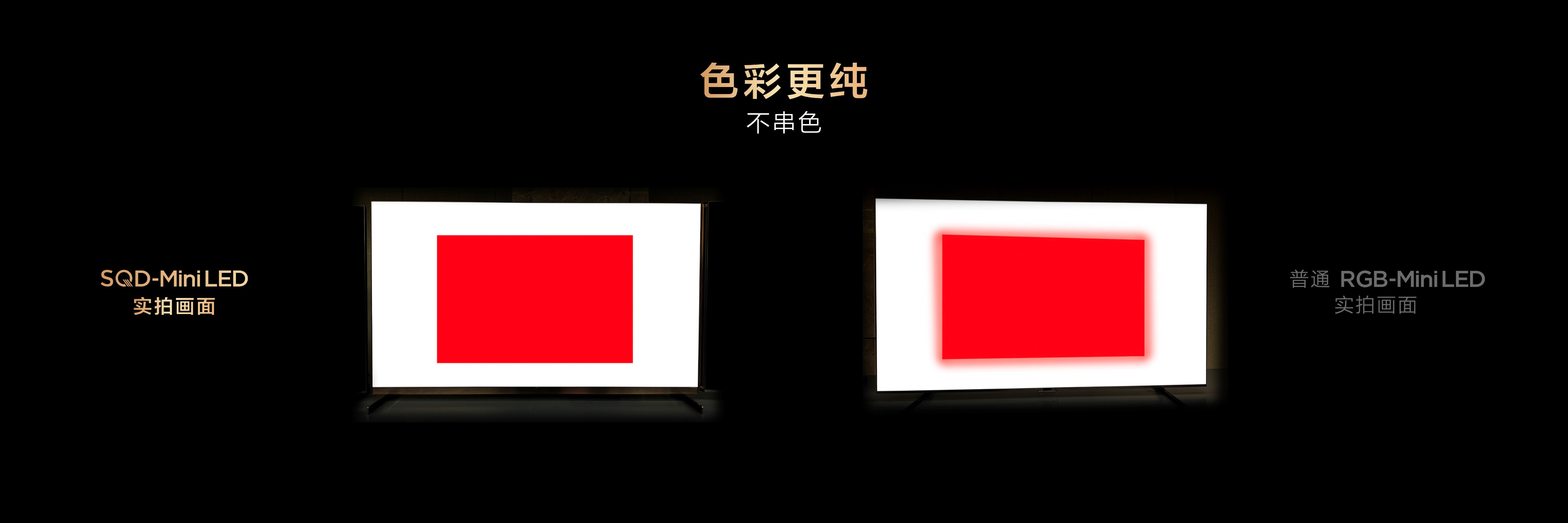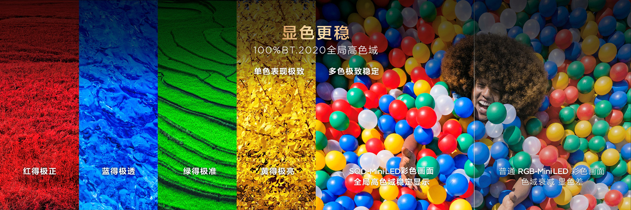 在色域表现上,SQD-Mini LED完成了从“局部高色域”到“全局高色域”的质变。传统RGB-Mini LED采用红、绿、蓝三色灯珠混合发光的模式,在显示复杂多色画面时,极易因各色灯珠发光比例变化导致色域漂移,同时相邻分区的不同色光还会产生光晕与色彩串扰,本质上只是“局部范围内的高色域”。而SQD-Mini LED通过“超级量子点”材料激发极致纯净的单色光,搭配搭载“晶粹高色阻”的超级蝶翼华曜屏,实现了100% BT.2020全局高色域。无论是单色的红玫瑰、绿茵场,还是色彩交织的城市夜景、奇幻大片,其色域值始终稳定无波动,色彩表现精准如一,从根源上解决了RGB-Mini LED的色彩缺陷。