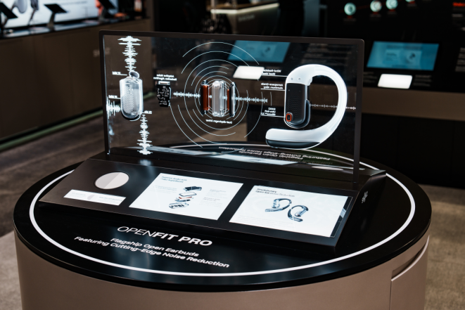 在CES展台,韶音特别围绕OpenFit Pro打造了沉浸式视听互动体验区,通过环幕投影,模拟办公、健身、咖啡厅、城市街头等多场景。参观者可亲身佩戴OpenFit Pro,直观感受其在各场景下的滤噪效果与音质表现,沉浸式理解“开放式滤噪”带来的体验革新。