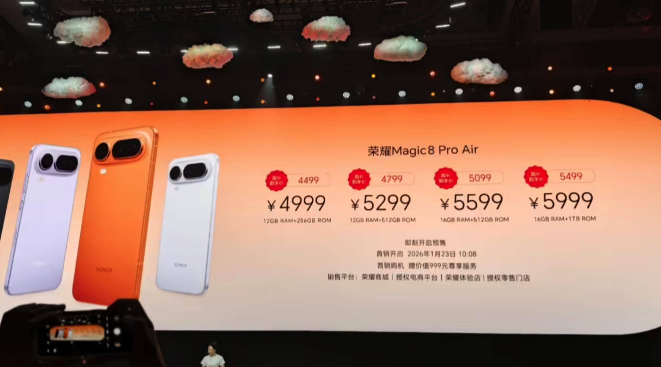 价格方面,荣耀Magic8 Pro Air提供了12GB+256GB、12GB+512GB、16GB+512GB以及16GB+1TB四个版本,起售价4999元。结合其搭载的天玑9500、潜望长焦、巨犀玻璃、IP69防水以及5500mAh大电池来看,这一定价极具杀伤力。