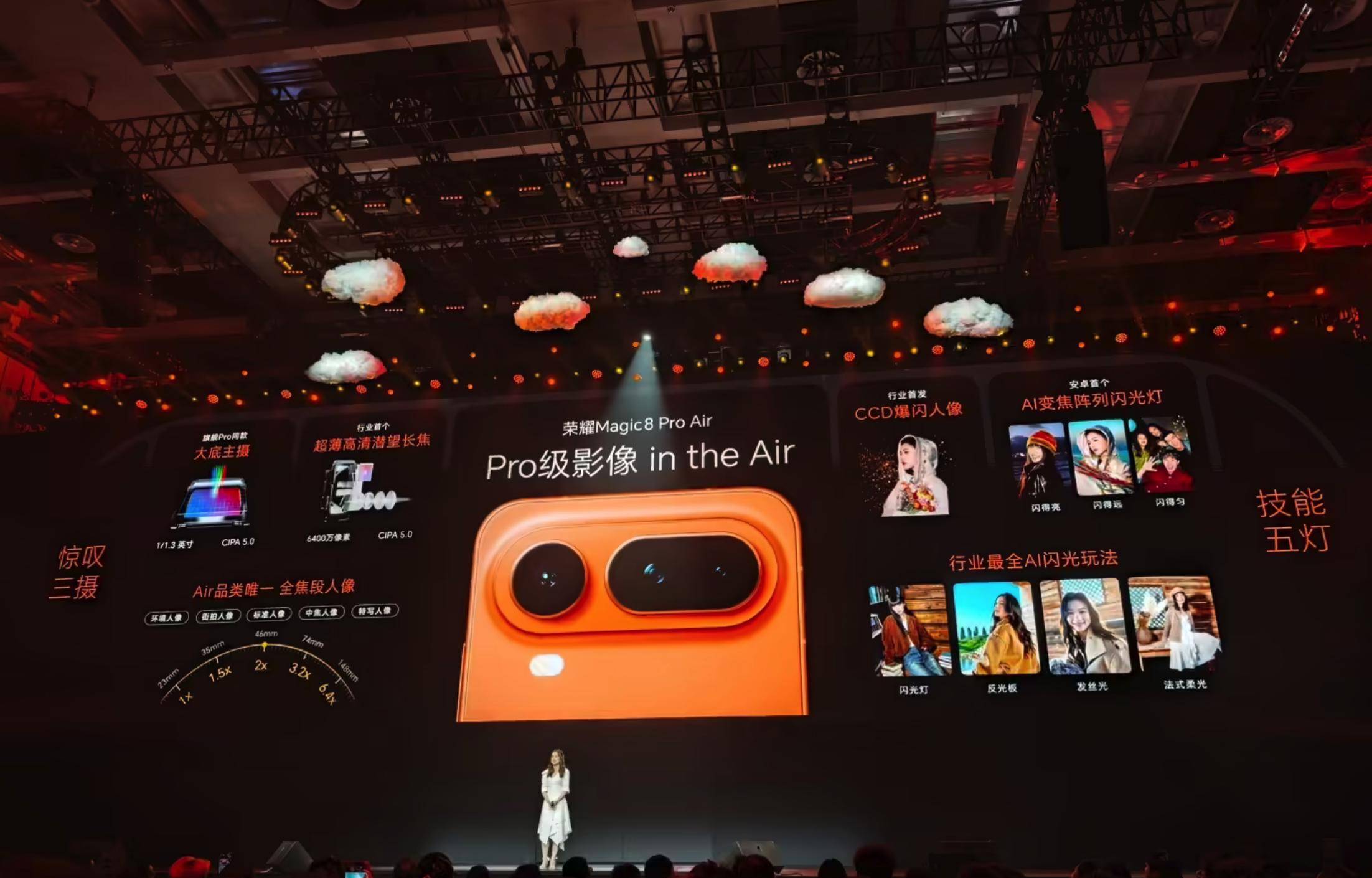 影像系统是Magic8 Pro Air的另一大杀手锏。它后置三颗Pro级镜头:5000万像素1/1.3"大底主摄(f/1.6光圈,CIPA 5.0级防抖)、5000万像素超广角,以及行业首个超薄6400万像素潜望长焦(1/1.2"传感器,支持3.2x光学变焦、100x数字变焦)。