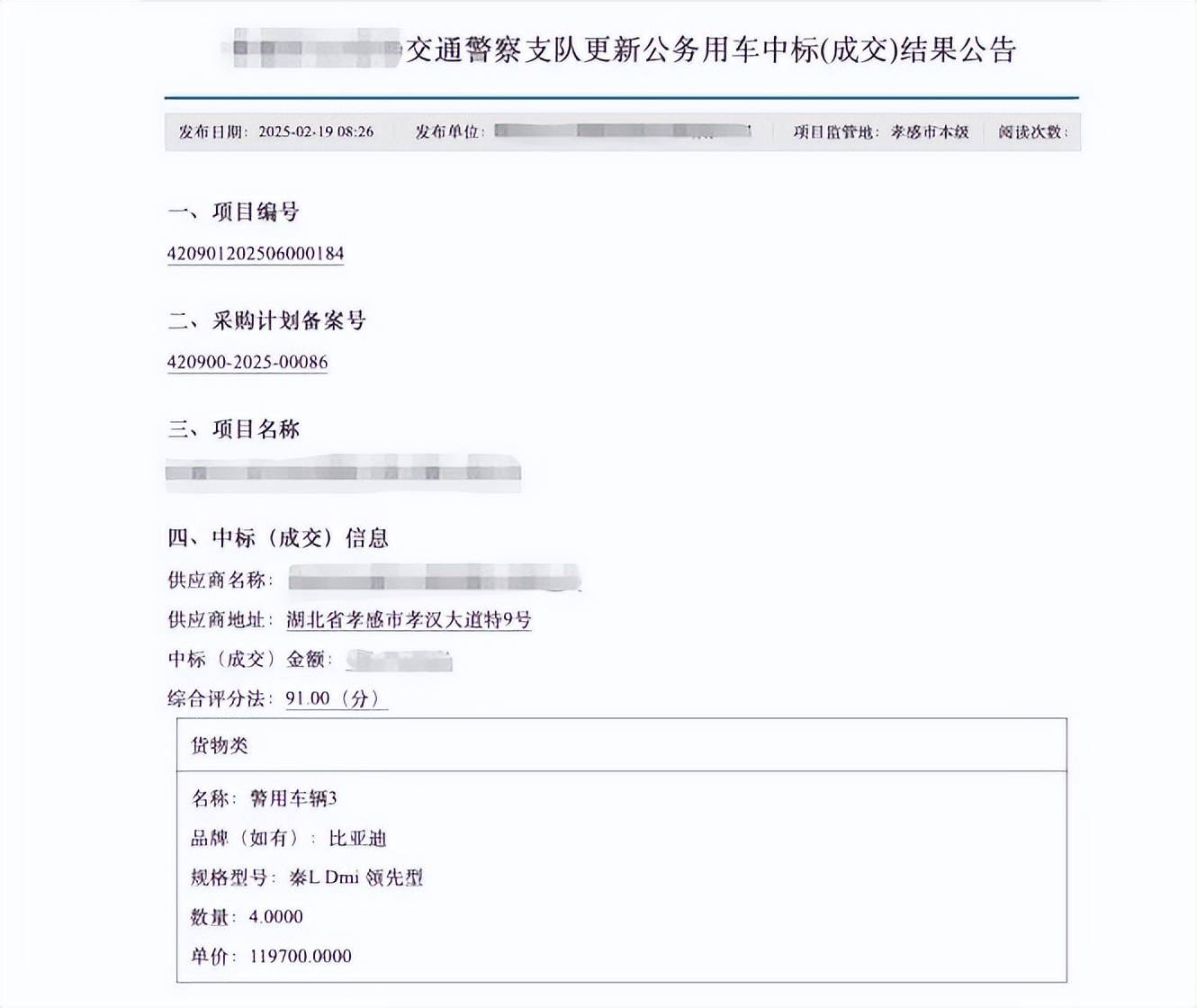 在全国多地政府的实际采购中,比亚迪已成为警车队伍中的“高频面孔”。公开的政府采购公告显示,安徽合肥、辽宁锦州、陕西西安、湖北孝感,再到贵州黔南,多地公安系统的警车采购项目中都出现了比亚迪旗下车型的身影。这些车型覆盖了秦PLUS、宋Pro、宋PLUS等多款主力产品,应用于日常巡逻、刑事侦查等多种执法执勤场景。