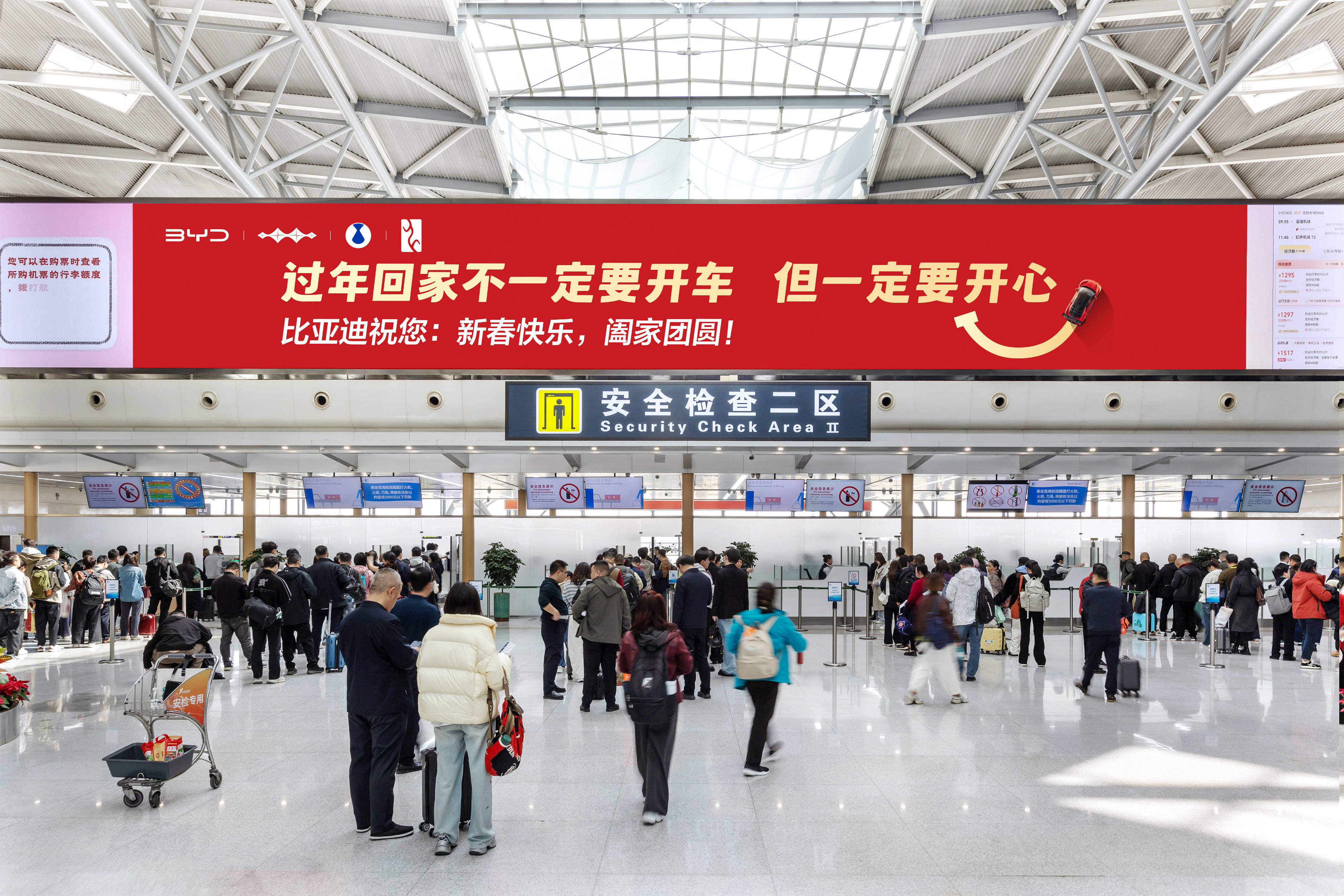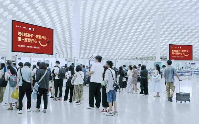 春节将至,比亚迪以一场别开生面的线下广告投放,向全国人民送上了温馨的新春祝福。本次广告以“过年回家不一定要开车但一定要开心”为核心传播话题,通过机场、商圈等公共空间的大屏展示,传递出品牌对每一位归家游子的深切关怀。