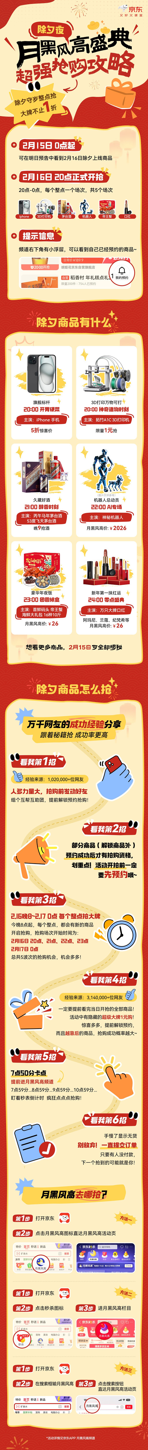 目前,活动预约通道已全面开启,即日起至2月16日晚8点前,打开京东APP搜索“月黑风高”,即可提前预约所有整点爆款,设置提醒不再错过。2月16日除夕晚8点至凌晨0点,锁定京东“月黑风高”超级盛典,五大整点好物不停歇,30亿红包放肆抢,216元iPhone、26元帝王蟹、春晚同款机器人等你来抢,共度科技感与烟火气兼具的团圆除夕。