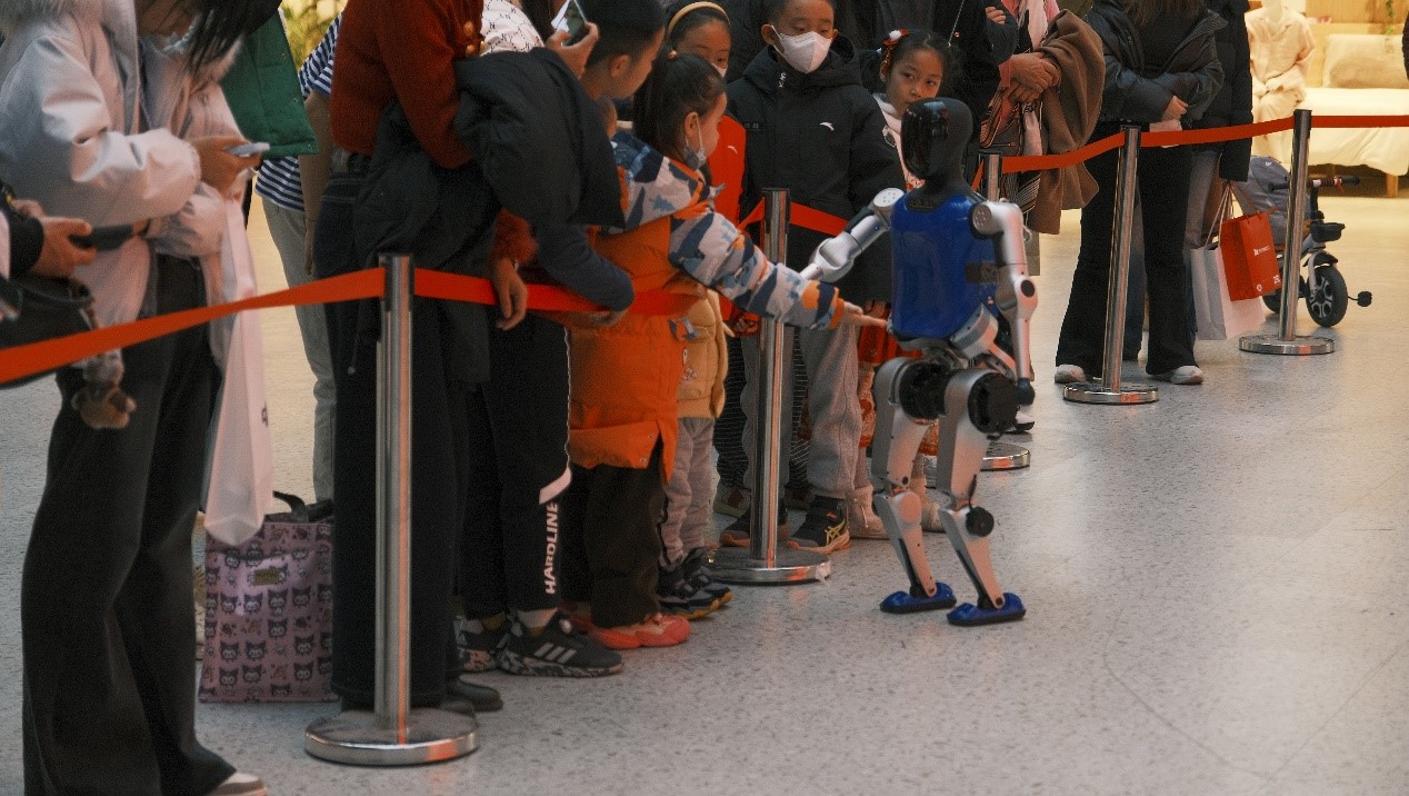 走进京东MALL北京双井店一层中庭,热闹氛围扑面而来。魔法原子MagicBot Z1憨态可掬地作揖拜年,Magic Panda机器熊猫凭借圆萌外形成为全场焦点,小朋友们围拢拍照、互动不停。松延动力家族更是“圈粉利器”:小巧灵活的小布米主动伸手握手、点头互动,排队打卡的家长与孩子络绎不绝;N2、E1两款人形机器人动作稳定、姿态自然,精准还原春晚舞台的流畅表现,引得围观市民阵阵惊叹。
