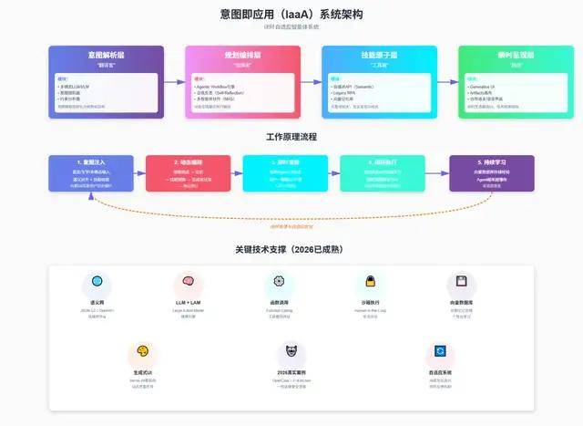 拆一下「意图即应用(IaaA)」这个闭环智能体系的黑盒子。把它想成四层串联的架构,共同跑完「意图→结果」的完整链路。