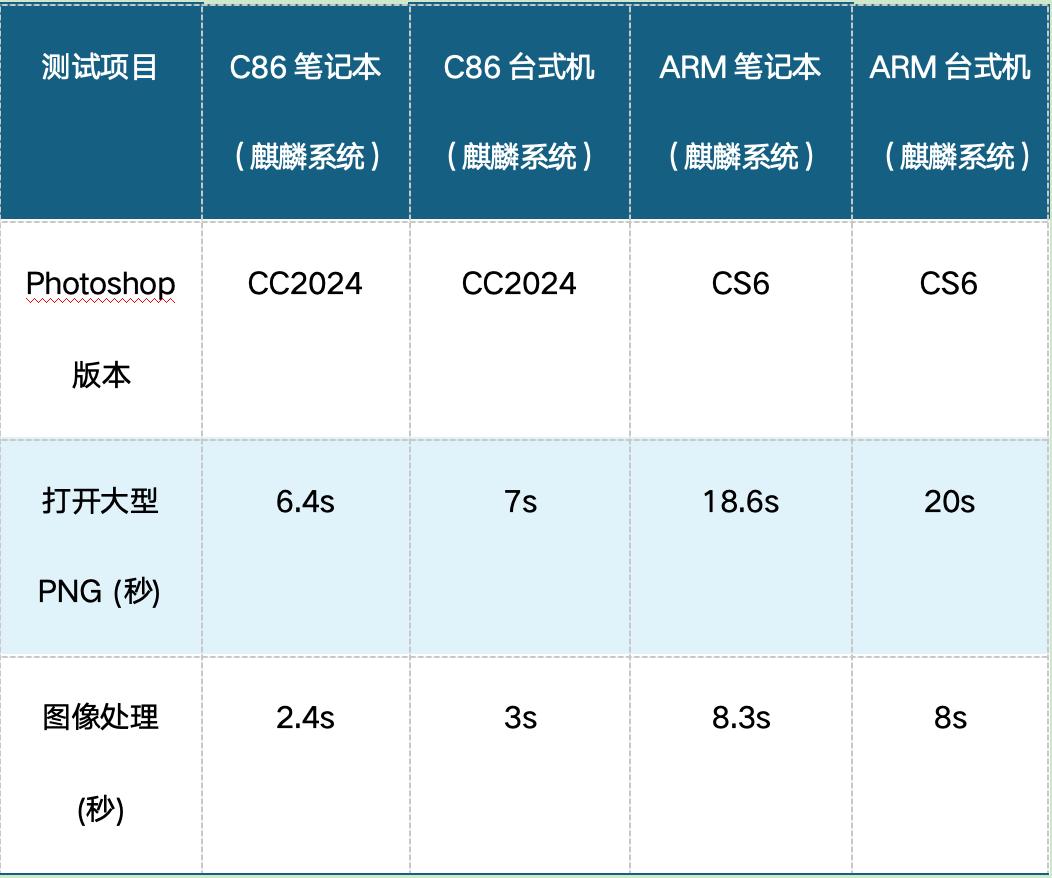 专业软件差距更为显著。Photoshop测试中C86支持CC2024最新版本,ARM仅能运行CS6;打开大型PNG文件,C86耗时6.4-7秒,ARM需18.6-20秒。Blender 3D渲染的差距则达到数量级:CPU渲染C86台式机仅需184.79秒,ARM笔记本需1312秒——差距超过5倍,且C86支持GPU渲染,ARM和鸿蒙PC均未适配。