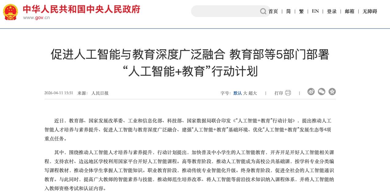 今年4月,教育部等五部门联合印发《“人工智能+教育”行动计划》,明确提出推动智能技术“与教育全要素融合、全过程贯通、全场景覆盖”。政策要求的三个关键词是“全覆盖”。