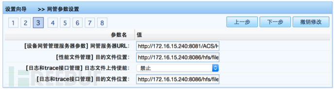 set ManagementServer : URL="http://10.3.0.130:8081/ACS/HMSServlet",Username="admin",Password="admin",PeriodicInformEnable=1,PeriodicInformInterval=10,PeriodicInformTime="0",ParameterKey="123",ConnectionRequestUsername="admin",ConnectionRequestPassword="admin",UpgradesManaged=1;