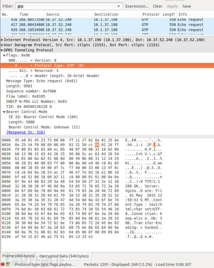 下图中,可以看到以GTP形式封装的用户数据,里面有一个HTTP请求。
