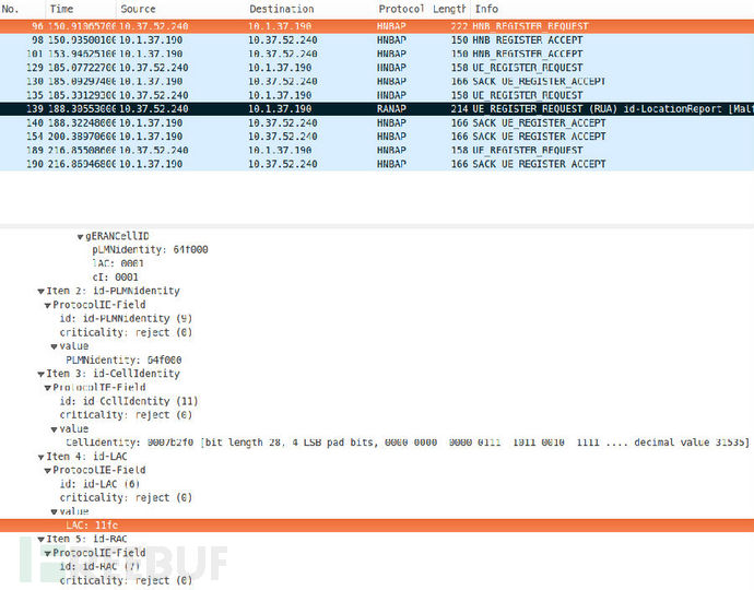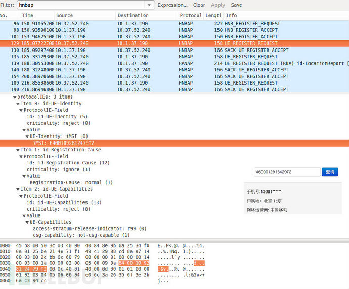 下图中可以看到,我们还捕获到了用户的IMSI号,并且可以通过反查来得到用户的手机号前几位。