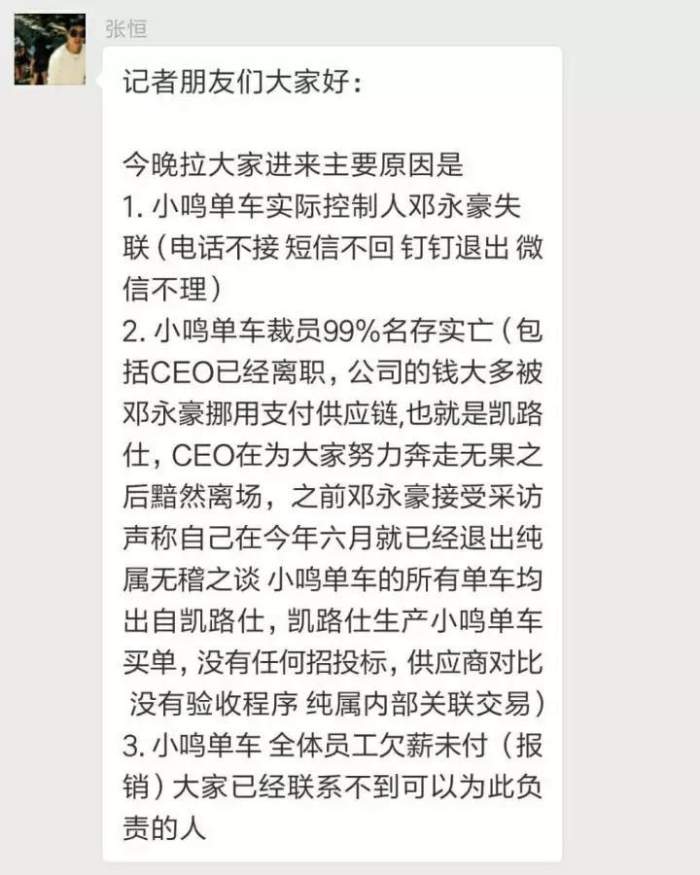 11月23日晚间,小鸣单车内部员工爆料称小鸣单车CEO陈宇莹已于今年10月离职,大量员工被单方面解除劳动合同,10月份工资至今尚未支付,而小鸣单车实际控制人邓永豪也处于失联状态。