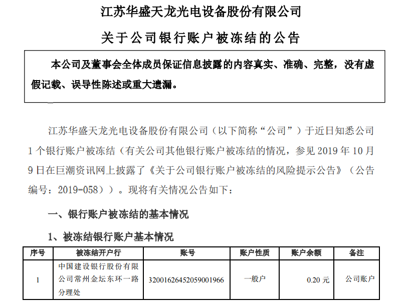 10月15日晚间,天龙光电(300029.SZ)发布公告称,因连带责任担保,天龙光电一银行账户遭到冻结。尴尬的是该银行账户余额仅为2毛钱。