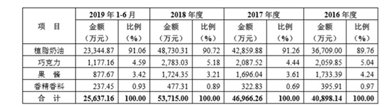 招股书资料显示,2016年到2019年上半年,植脂奶油的营业收入占海融食品营业收入的比例分别为89.76%、91.26%、90.72%和91.06%。可见,其他产品占其营业收入的比例只有10%左右。