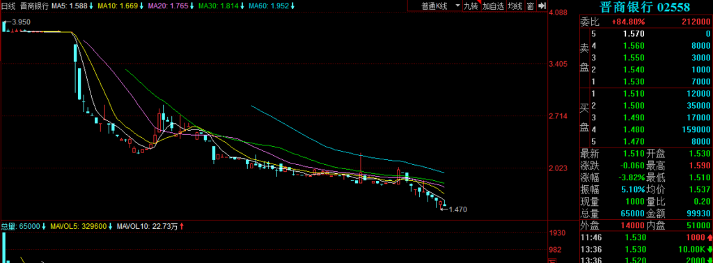 截至12月23日收盘,晋商银行下跌3.82%,报收1.51港元/股。而在12月20日,晋商银行还曾盘中一度跌至1.47港元/股,创下历史新低。增资近10亿元的利好消息也挽救不了晋商银行的股价下跌。