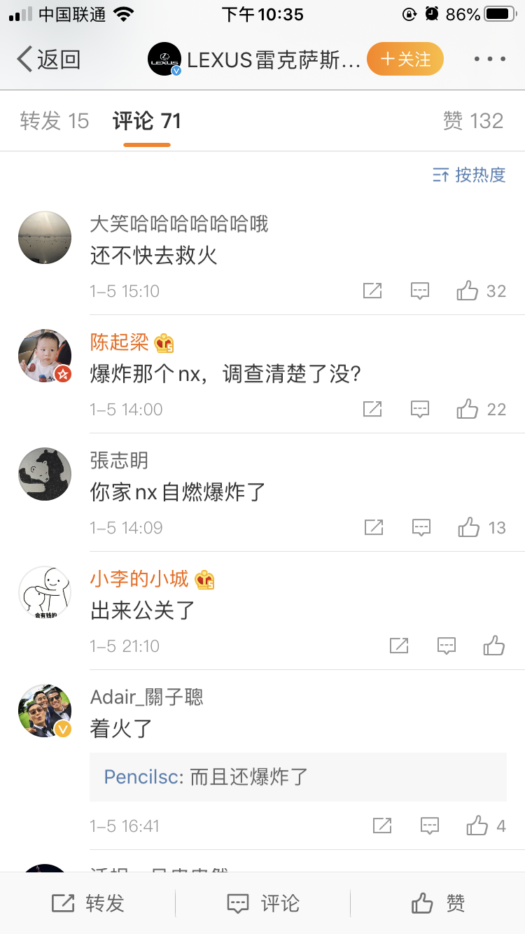 如今,关注此事的网友已经纷纷在雷克萨斯官微上发言,询问起火爆炸的原因,GPLP犀牛财经也发送调研函询问,但可惜的是,目前官方并未作答。