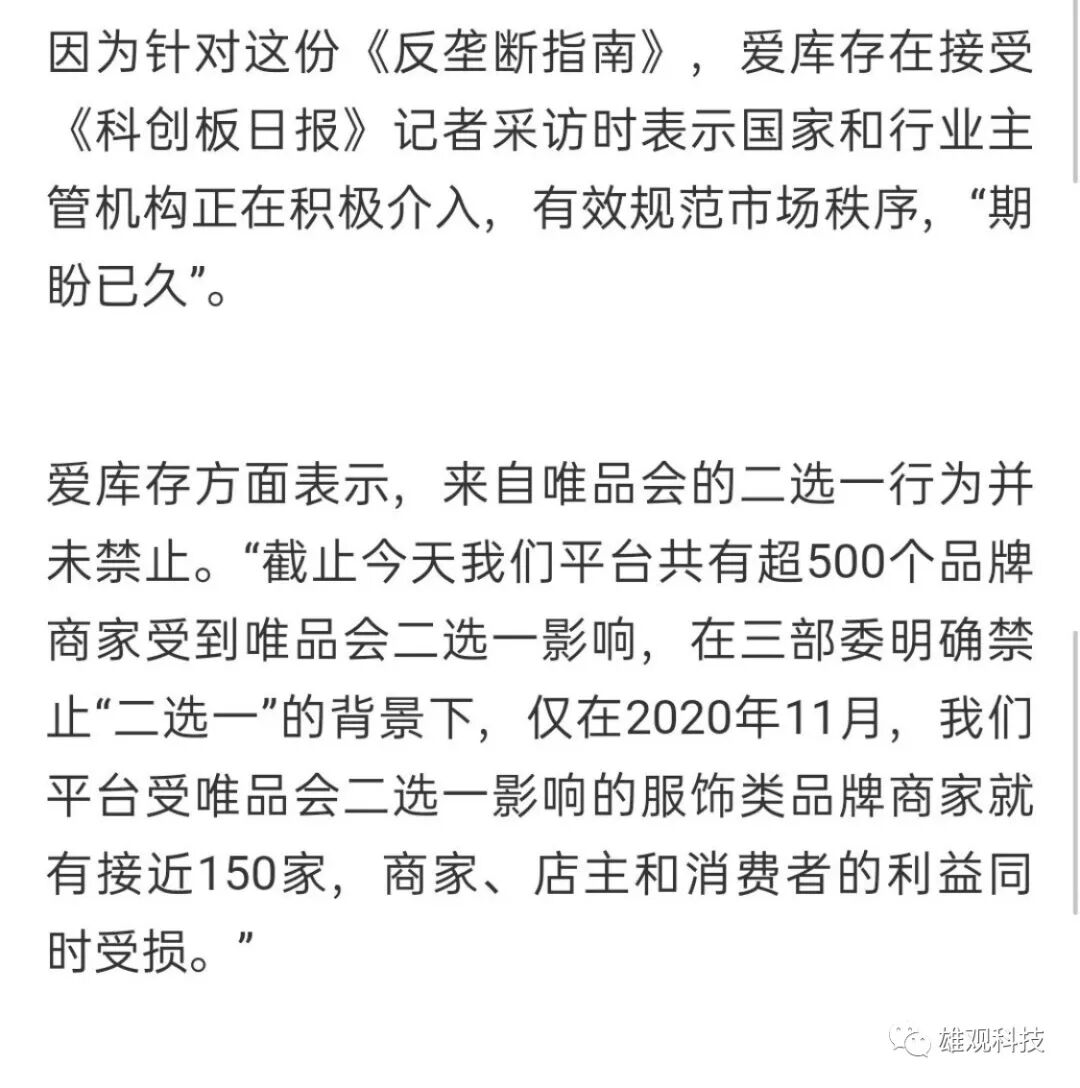 专栏观察 中国电商苦“二选一”久矣!商户成替罪羊、用户成冤大头 王冠雄频道 / 2020-11-23 20:00:20 生成海报分享到微信 中国互联网真的要变天了。 这个剧变,不是指谁卖货又创记录了,谁IPO造富了,谁股价创新高了,谁崛起,谁陨落甚至谁爆雷了,而是真正决定性的游戏规则改变----越来越多权威且清晰的信号表明:监管层要对愈演愈烈的大型互联网平台们垄断行为“动真格的”了!尤其是千夫所指的“二选一”现象。 如果属实(坦率说我觉得进度条依稀可见),这意味着,长期深受“二选一”困扰的商户、被动失去品牌选择权从而间接导致权益损害的用户,都有望从这个困局中彻底突围,迎来一个正当的充分竞争环境。这,本来就是正常的,本就应该是市场经济的题中应有之义。 众所周知,我是一个忠实的互联网信徒,也是身为职业经理人亲历过5家知名互联网公司IPO的老兵。在此,我想旗帜鲜明给出自己的态度:“二选一”是中国互联网尤其是电商业的不治之症,是毋庸置疑的不正当竞争;只有从法规层面彻底根除,中国互联网才能真正迎来下一个黄金25年。 面对这个正在深刻影响中国互联网格局的大事件,作为资深新经济观察家,本号不吝浅陋,今天就来简单向大家拆解一下。 【权威部门吹响反垄断号角,约谈27家互联网巨头】 相信整个中国互联网行业都对这一天感到震撼乃至刻骨铭心:11月10日,市场监管总局公开就《关于平台经济领域的反垄断指南(征求意见稿)》征求意见。耐人寻味的是,这正是平台们的重头戏电商年度大促“双十一”的前一天。 紧接着,仅仅过了两天的11月12日,中国政府网就公布了《国务院办公厅关于同意建立反不正当竞争部际联席会议制度的函》,核心信息是一句话:“按照《中华人民共和国反不正当竞争法》相关规定和有关文件精神,认真组织开展工作”。 字越少,事越大。如果再把时钟向回拨几天,你会发现这根本就是一连串强劲的组合拳: 11月6日,市场监管总局、中央网信办、税务总局三部门联合召开规范线上经济秩序行政指导会。阿里巴巴、腾讯、百度、字节跳动、美团、滴滴、拼多多、京东、奇虎360、搜狗、快手、58同城、微店、新浪微博、多点、贝壳找房、国美在线、饿了么、小红书、携程、苏宁、同程、贝贝网、云集网、蘑菇街、兴盛优选、唯品会等27家主要互联网平台企业代表参加会议(此处排名不分先后)。 会议强调,互联网平台企业要直面存在的问题,坚持依法合规经营,勇于担当社会责任,不断强化自我约束和自我管理,共同促进线上经济健康规范发展。 11月3日,即将创下全世界企业上市募资记录的蚂蚁金服在上海、香港两地同时上市的计划,在IPO前夜被紧急叫停,实际控制人马云及董事长井贤栋、总经理胡晓明被有关部门联合进行监管约谈。蚂蚁金服董事长井贤栋坦言,“过去的这几天是蚂蚁集团和阿里历史上最黑暗、最艰难的两天。” 连夜叫停标志性超级企业IPO、规范线上经济秩序行政指导会、出台反垄断征求意见、结合监管层连续发文驳斥,这一系列组合拳的高度和力度只能来自顶层设计。至此,还需要再怀疑互联网反垄断的决心吗? 【“二选一”遭点名排榜首,已成中国电商不治之症】 全行业瞩目的是,行政指导会公开从九个方面对互联网平台企业提出了明确要求,其中名声在外的“二选一”被点名并赫然名列榜首: “互联网平台企业不得滥用市场优势地位排除限制竞争。不得实施滥用市场支配地位、垄断协议和违法进行经营者集中等行为;不得滥用优势地位强迫商家站队‘二选一’,对平台内经营者的选择平台行为实施不合理限制或附加不合理条件;不得利用技术手段实施妨碍、破坏其他经营者合法提供的网络产品或服务正常运行的行为。” 地球人都知道,每年618、双11年底大促的时候,阿里巴巴、京东互相指责对方裹挟旗下商户搞“二选一”,已经成为固定上演的公关对决戏码。这几年,随着拼多多的崛起,也果断被动OR主动加入了这场三国志。 那么问题来了,是不是只有超级平台才有能力实施“二选一”呢?答案是非也,理论上,任何一个在垂直领域具备一定掌控力的平台都有这个能力,也有这个动机。所以人们看到,无论老牌还是新兴,电商平台们纷纷先后爆出“二选一”。 在9月3日爱库存公开发表抵制唯品会不正当竞争声明,表示唯品会明令要求商家二选一,不得与爱库存继续合作,否则强制下架相关商品。爱库存要求,唯品会立刻停止‘二选一’行为。”而对此,唯品会高级副总裁在我朋友圈相关转发新闻下跟贴:“没有的事”。 根据11月10日《科创板日报》的最新报道,爱库存方面表示,来自唯品会的二选一行为并未停止。 (摘自科创板日报11月10日相关报道) 追赶者义愤填膺指责“大哥搞垄断”,领先者风轻云淡讽刺“小弟想上位碰瓷”。从公关战略上说,这招确实非常有效,也成功地转移了一部分不明真相的群众。广大吃瓜群众看得审美疲劳,电商平台们却乐此不疲。此时,真正的受害者商户们却敢怒不敢言,被动失去品牌选择权间接导致正当权益受损的用户们自然更是没人关心了。 “二选一”,这个中国电商的这个不治之症,是时候根除了! 【中国电商苦“二选一”久矣,商户成替罪羊、用户成冤大头】 所以,令一贯顺风顺水、公关能量强大、“携用户以令监管”的互联网巨头们根本没想到的