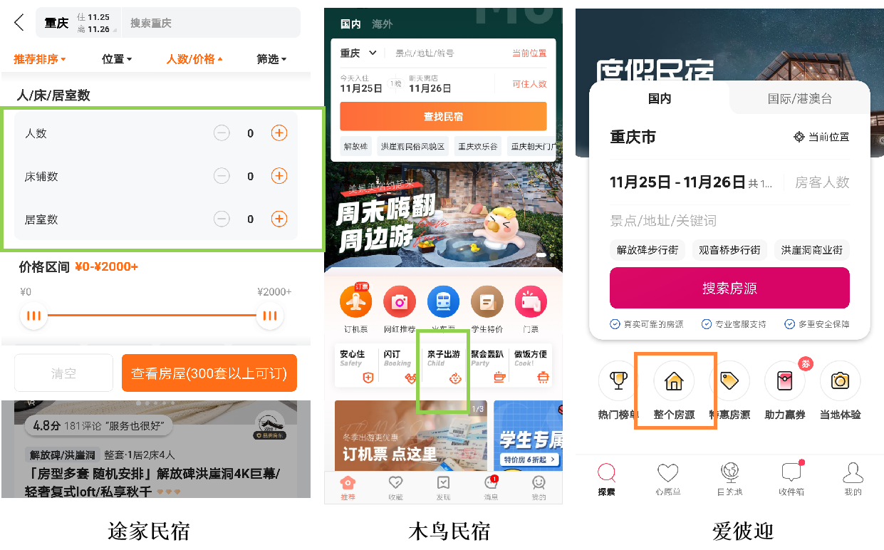 从房源构成来看,途家民宿在首页没有亲子/家庭游的分类,而是选择在房源筛选界面设计人数等个性化需求,灵活性高,可以根据出行需求自由匹配所需房源;木鸟民宿选择在首页增加亲子出游的icon,这与其在成立之初就主打整租房源有关,其平台在全国范围内拥有最大比例的两室一厅整租房。爱彼迎虽然在首页增加整个房源icon,这被普遍认为是爱彼迎中国化的表现之一,但从房源构成来看,爱彼迎主打共享住宿,产品以合租为主,即使是整租房源也仍然以一室房源为主,与亲子家庭匹配度较低。