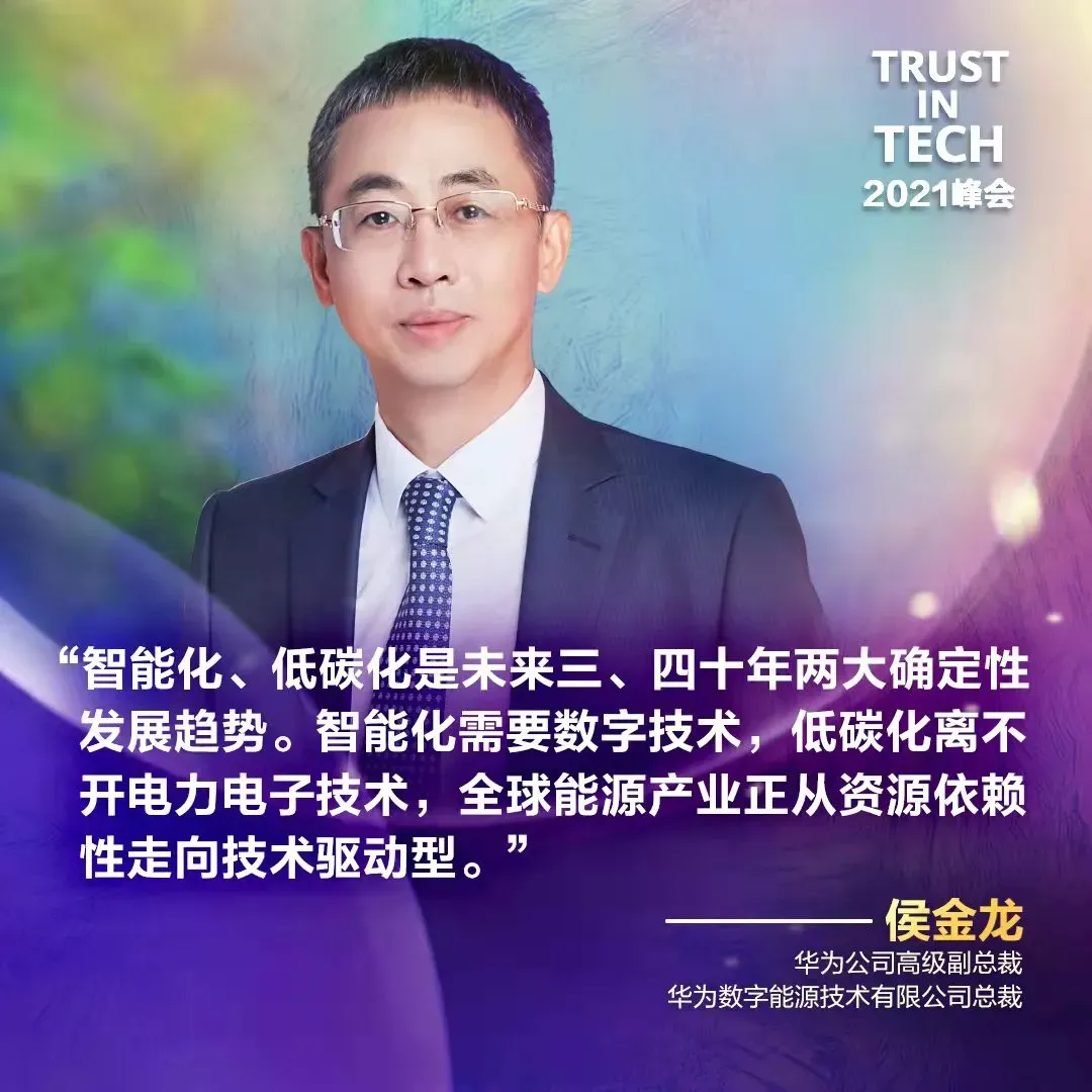 作为企业界代表,华为公司高级副总裁、华为数字能源技术有限公司总裁侯金龙进行了“技术创新,共建低碳智能社会”的主题演讲,畅想数字能源革命,提出“智能化、低碳化是未来三四十年的两大确定性发展趋势”、“用比特管理瓦特”、“科技与自然共生”,公布了华为数字能源的创新路线图,也勾勒了低碳智能社会的美好未来图景。