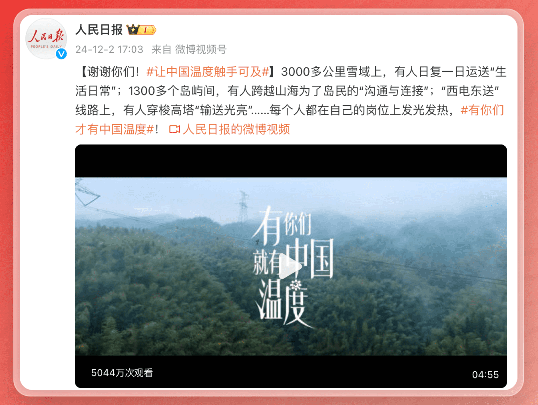看到人民日报微博的《有你们,才有中国温度》视频短片,看到国家电网、中国邮政、华为等企业奋战在祖国河山的东西南北,将电力、物流、智能生活送到了偏远地区,跨越山海,共同筑造中国温度。