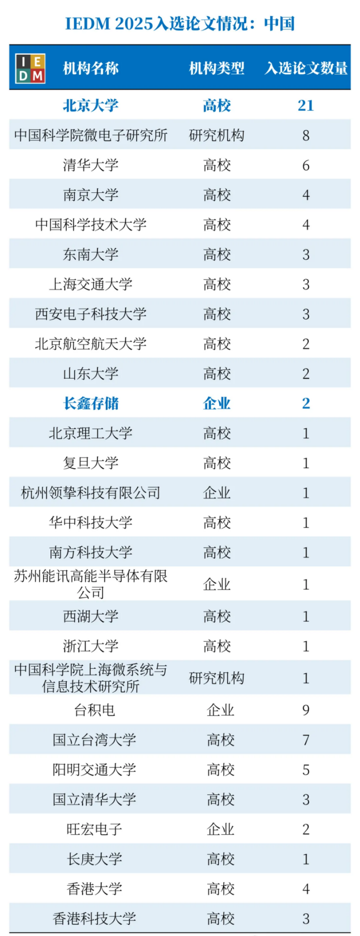 IEDM作为半导体器件领域的顶级会议,其论文录用情况反映了各研究机构在前沿技术领域的布局与实力。企业方面,DRAM制造商长鑫存储凭借3D铁电存储器(FeRAM)与后端工艺集成的新型多层堆叠DRAM架构两项创新成果也成功入选,论文入选数量位居国内企业之首。