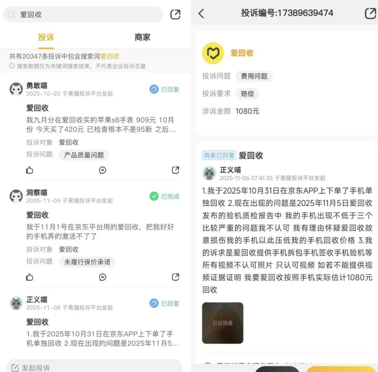截至目前,在黑猫投诉平台上,搜索“爱回收”的投诉量已高达20347条,其中绝大部分都指向恶意压价。