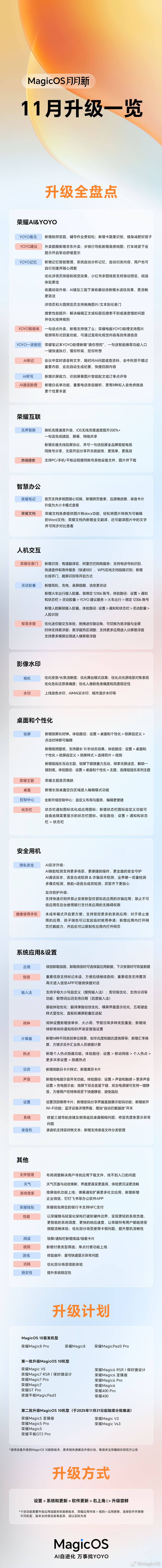 11 月 22 日消息,荣耀MagicOS昨日公布 11 月升级一览,支持 AI 帮记帮写帮看,AI 帮接电话还能切换音色,无界智联投屏与分享一句话搞定,零重力通透设计支持长时钟锁屏、视频锁屏。