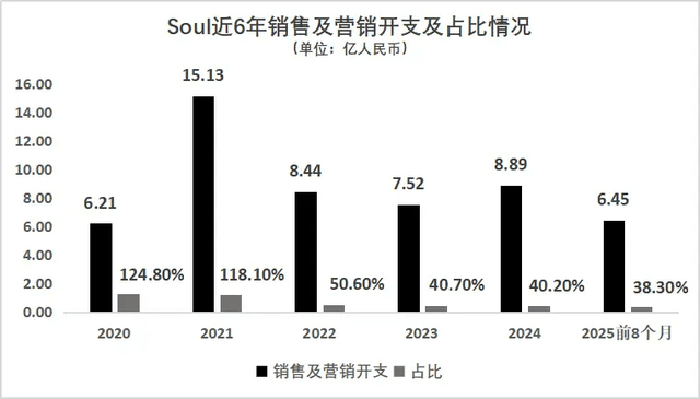 这种转变的背后,是Soul对经营策略的深度调整。过去几年,Soul曾通过高额的营销投入换取用户爆发式增长,但在最新的财报中,其销售及营销开支占比已大幅回落至38.3%,远低于2020年惊人的124.8%。令人欣慰的是,营销“刹车”并未导致用户“跳车”。