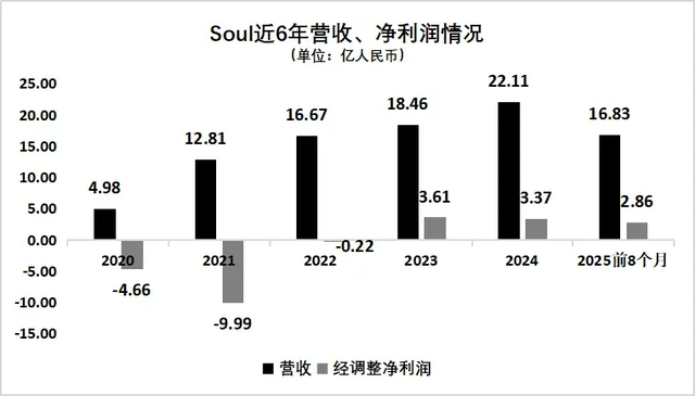 招股书数据显示,2025年前8个月,Soul不仅实现了16.83亿元的营收,同比增长17.86%,更重要的是,其经调整净利润达到2.86亿元,同比大增73%。这一数据标志着Soul已经摆脱了过去“烧钱换增长”的陷阱,进入了自我造血的良性循环。