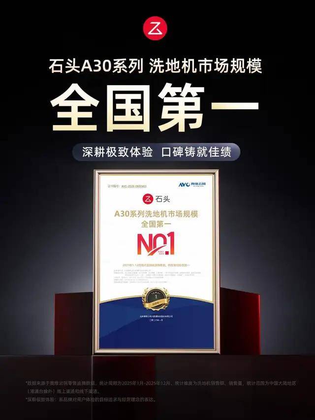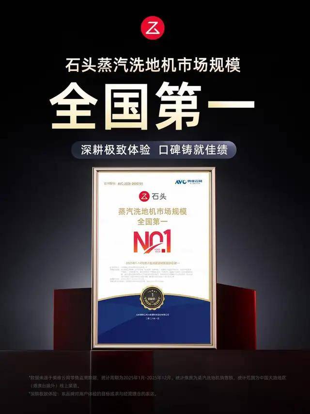 据奥维云网1月13日公布的数据,石头洗地机一举斩获“蒸汽洗地机市场规模全国第一”与“A30系列洗地机市场规模全国第一”的双冠荣誉。在十五五健康优先战略的大背景下,这一市场反馈有着不寻常的价值,并非简单的销量胜利,而是标志着中国家庭的清洁观念正在发生质的跃迁——从追求表面的基础洁净,转向了对主动健康管理的深层渴望。