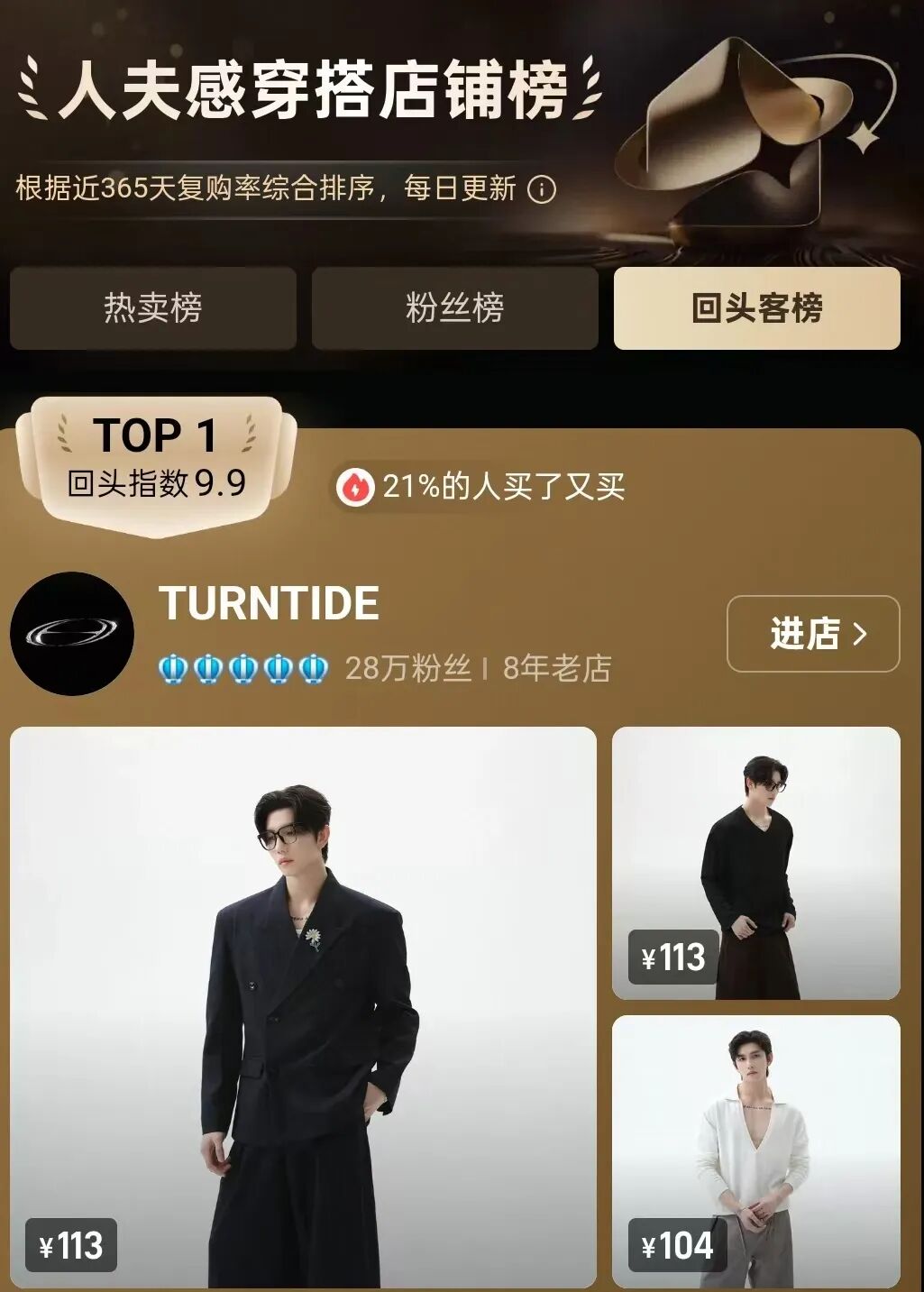 但TURNTIDE却在2025年逆势飙涨,GMV同比翻了四倍,净利润同比增长了50%,还登上了淘宝神店榜——人夫感穿搭店铺榜Top1。