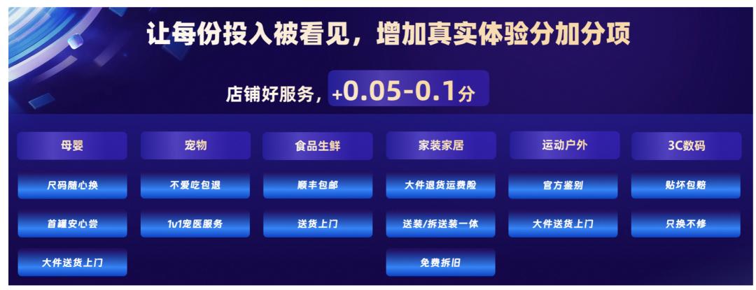 围绕商品质量、物流速度、服务保障三个方面,淘宝天猫将推出各个细分小项,分别可加分0.05-0.1分不等。诸如面向家装行业,淘宝天猫推出的加分项包含拆送装一体、免费拆旧等;面向宠物行业,平台推出1v1宠医服务;面向食品行业,推出顺丰包邮;面向母婴行业,推出尺码随心换等。