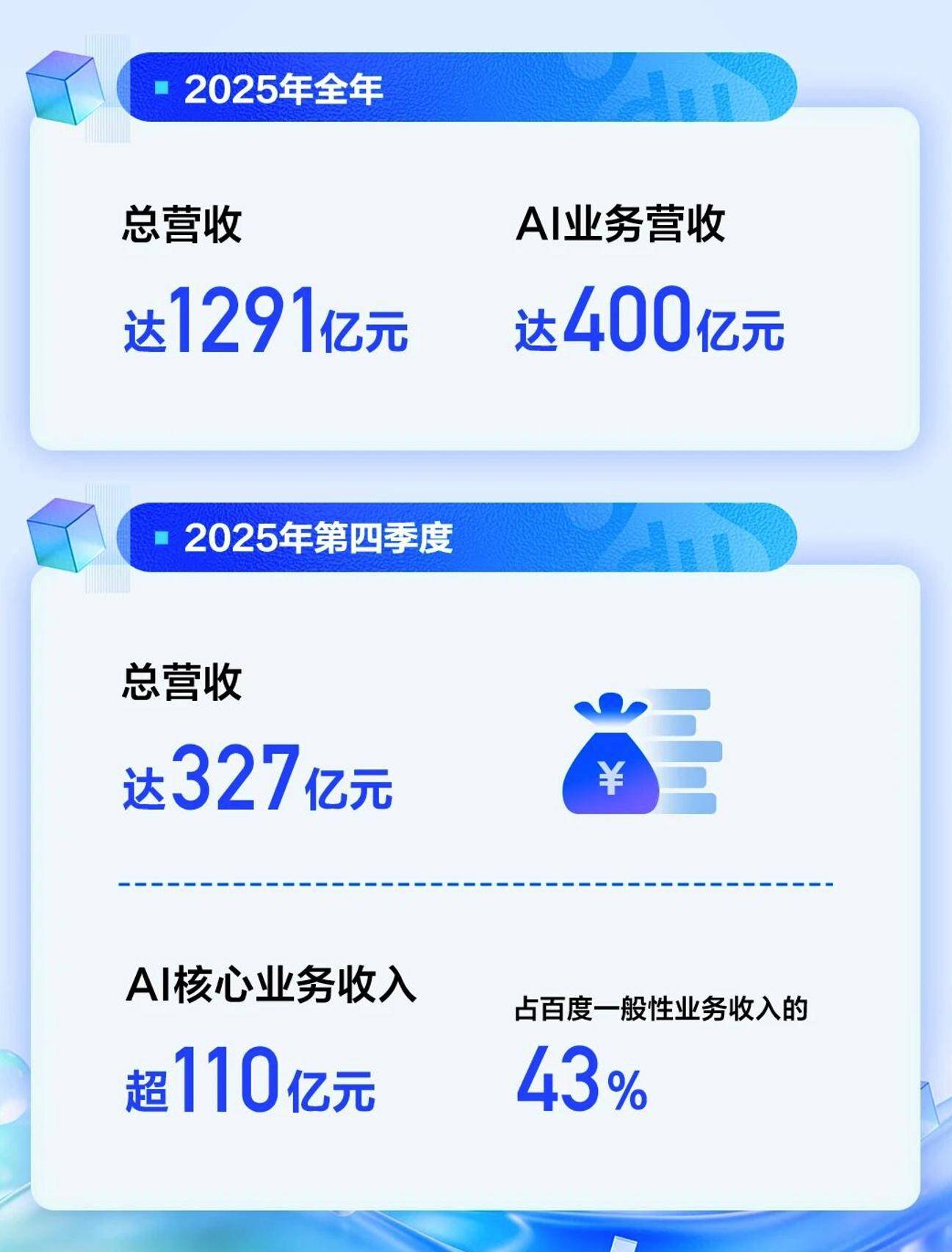2月26日,百度发布2025年第四季度及全年财报,显示2025年总营收达1291亿元,AI业务营收达400亿元;四季度,百度总营收327亿元,AI业务收入占百度一般性业务收入的43%,超出市场预期。
