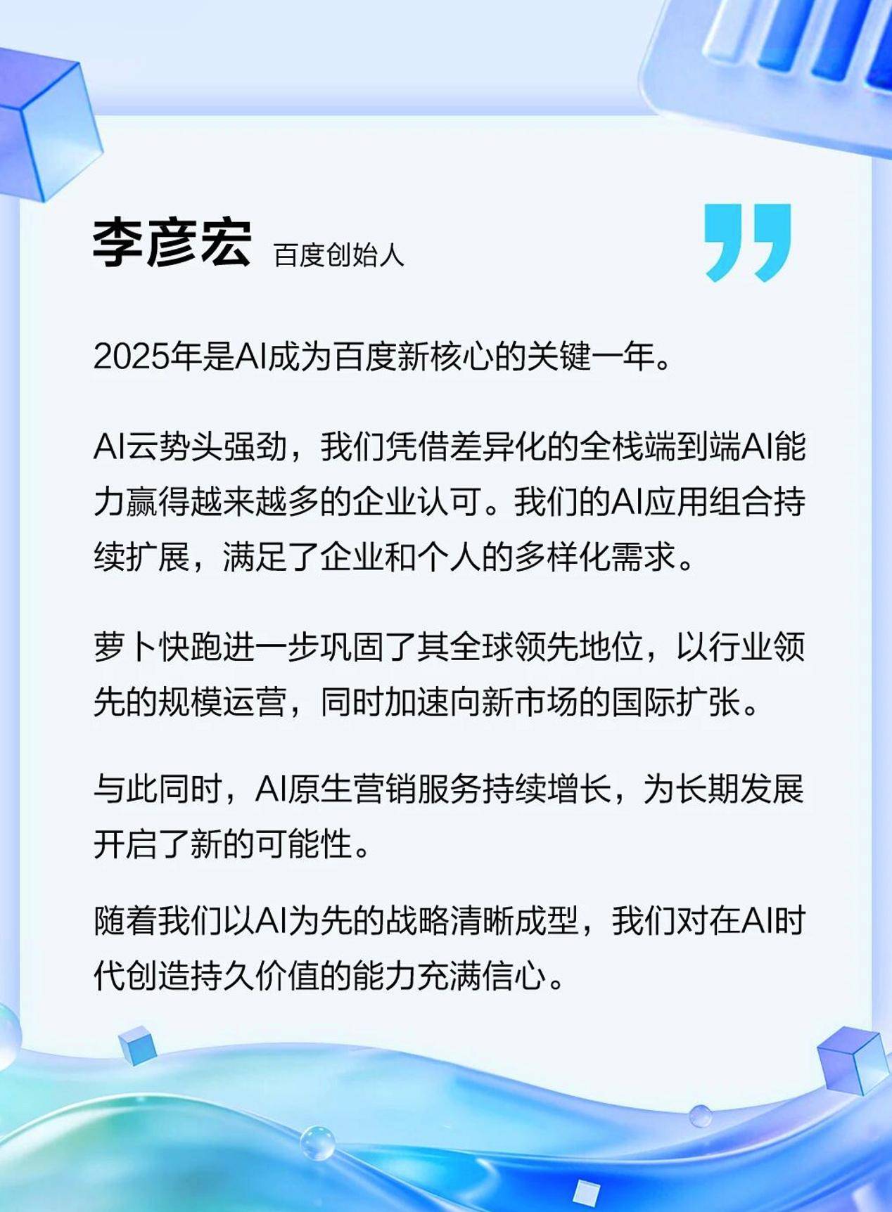 “2025年是AI成为百度新核心的关键一年。AI云势头强劲,我们凭借差异化的全栈端到端AI能力赢得越来越多的企业认可。我们的AI应用组合持续扩展,满足了企业和个人的多样化需求。萝卜快跑进一步巩固了其全球领先地位,以行业领先的规模运营,同时加速向新市场的国际扩张。与此同时,AI原生营销服务持续增长,为长期发展开启了新的可能性。”百度创始人李彦宏表示,“随着我们以AI为先的战略清晰成型,我们对在AI时代创造持久价值的能力充满信心。”