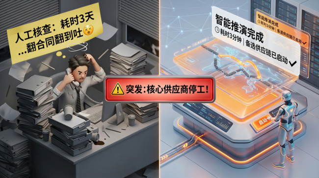 举一个具体的场景。当核心供应商突然停工时,传统做法是采购经理打电话、翻合同、查邮件,花两三天搞清楚影响范围。