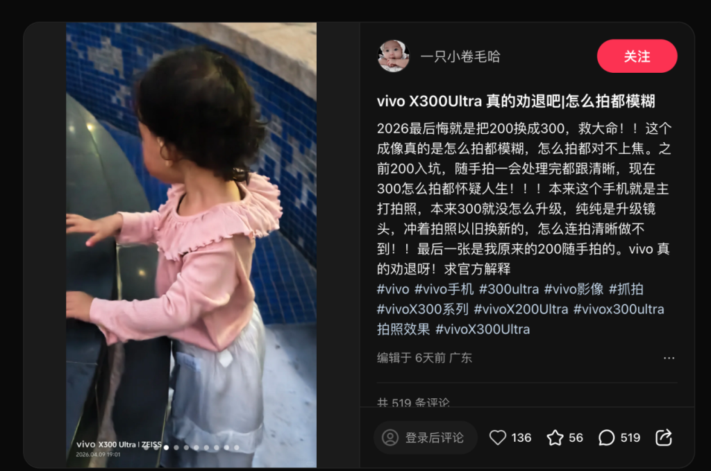 最近,小红书出现一批关于vivoX300Ultra的吐槽帖,内容大多集中在:拍照糊、对焦飘、夜景翻车。有用户说,从X200Ultra换过来,“从被惊艳到被惊吓”。还有用户用了三天,写下三个字:很疲惫。