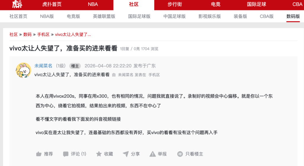在虎扑论坛,有用户反映X300Ultra录制视频时会出现中心偏移,绕着物体拍摄,画面里的物体却不在中心了。还有用户在什么值得买上留言,直言“X300Ultra只适合白天拍照的人,夜景和运动场景千万别买”。